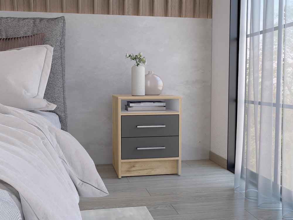 Mesa de Noche Douglas, Beige y Plata Oscuro, con Un Entrepaño Superior y Dos Cajones Organizadores X2