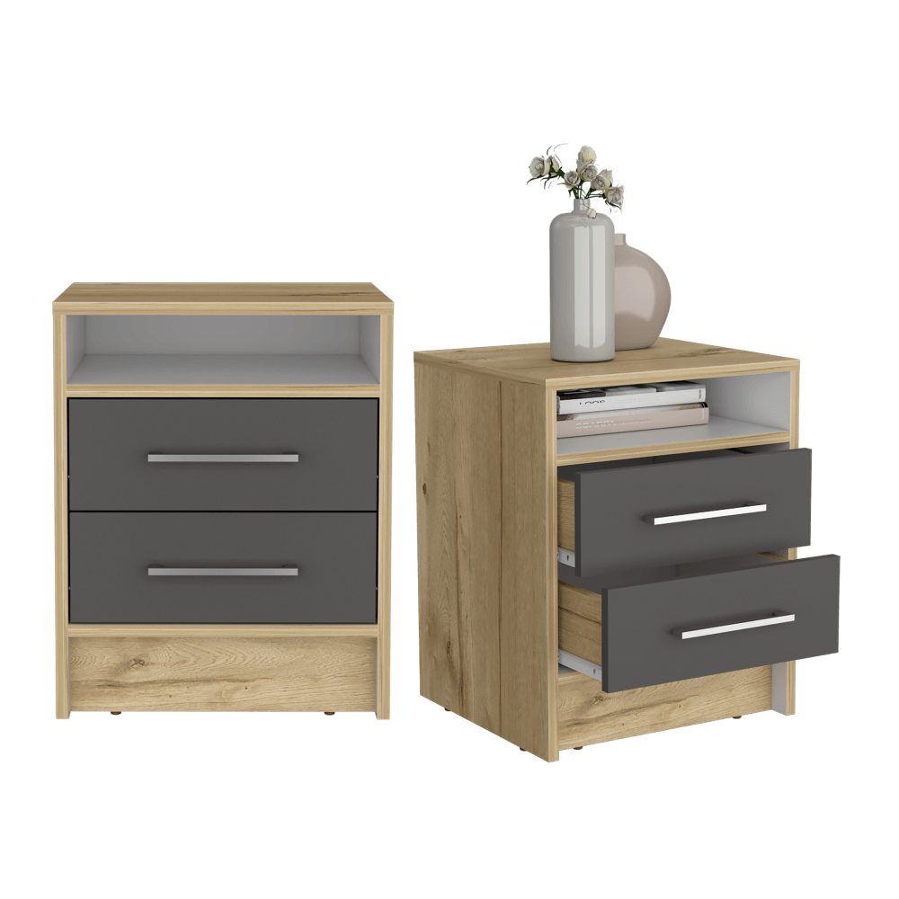 Mesa de Noche, con manijas metalicas, dos cajones, espacio para libros y objetos decorativos.