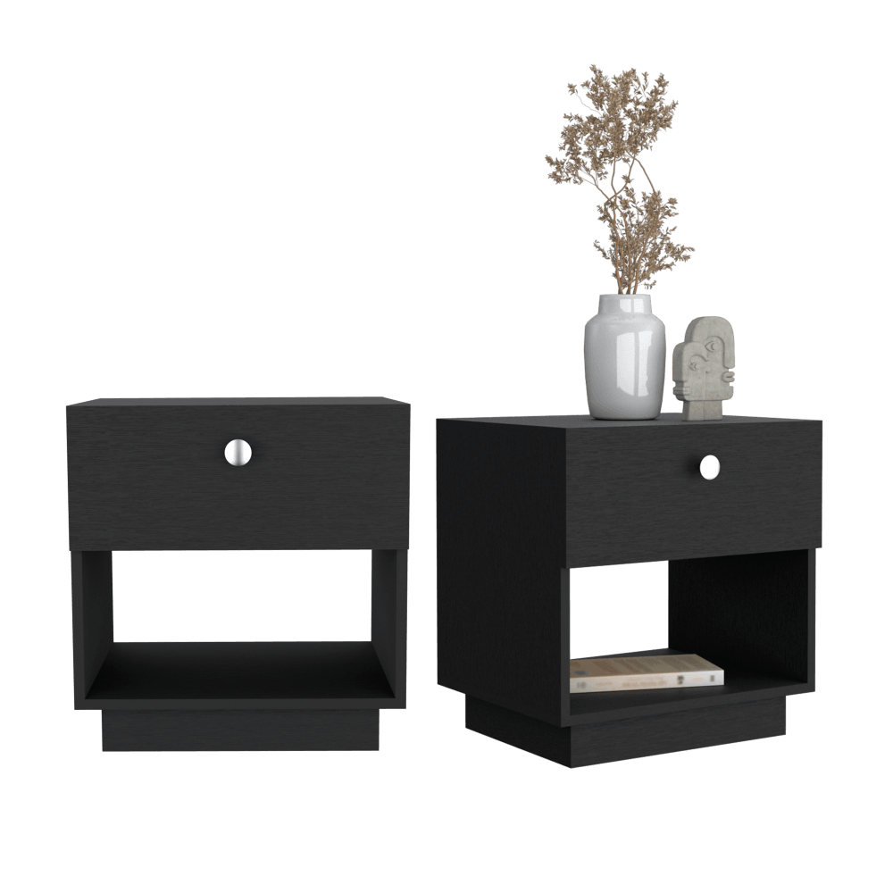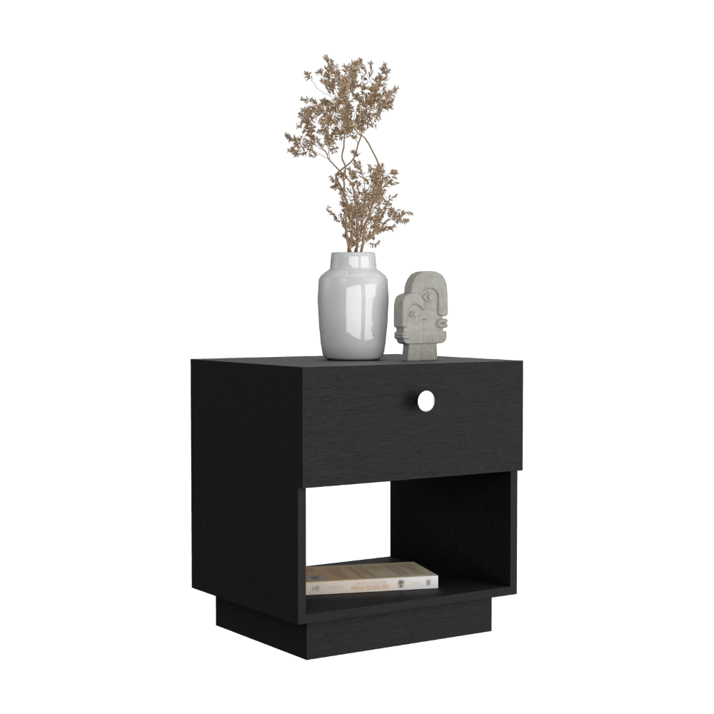 Mesa de Noche, con superficies para ubicar pertenencias, cajon para almacenar, y espacio para lámpara de mesa.