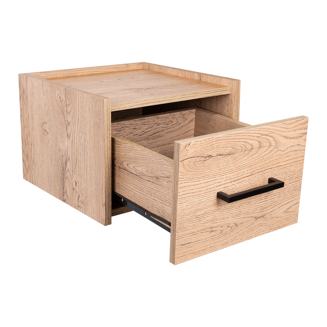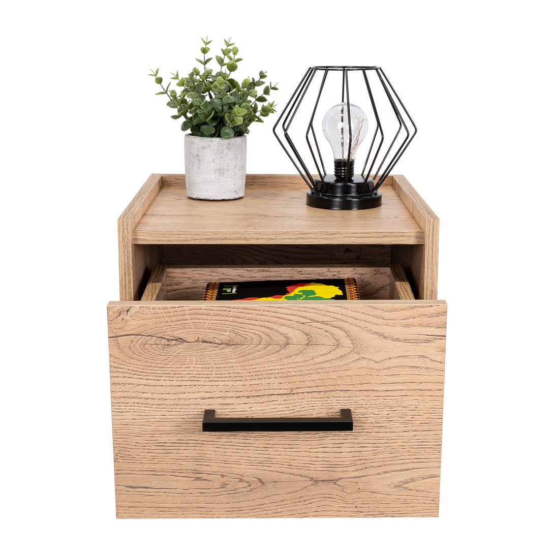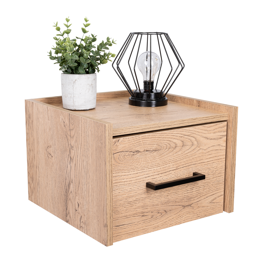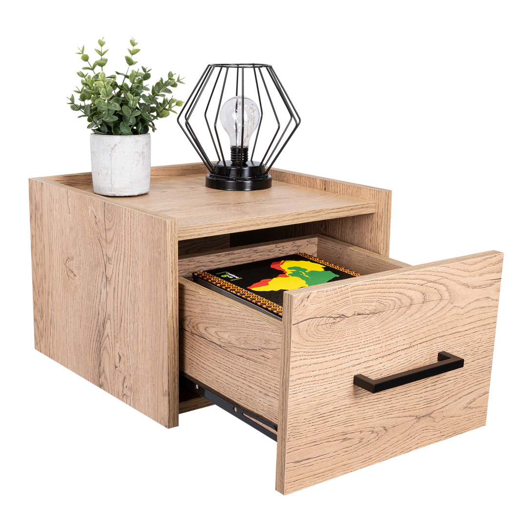 Mesa de Noche Flotante, con espacio para colocar objetos decorativos, diseño moderno, y un cajón.