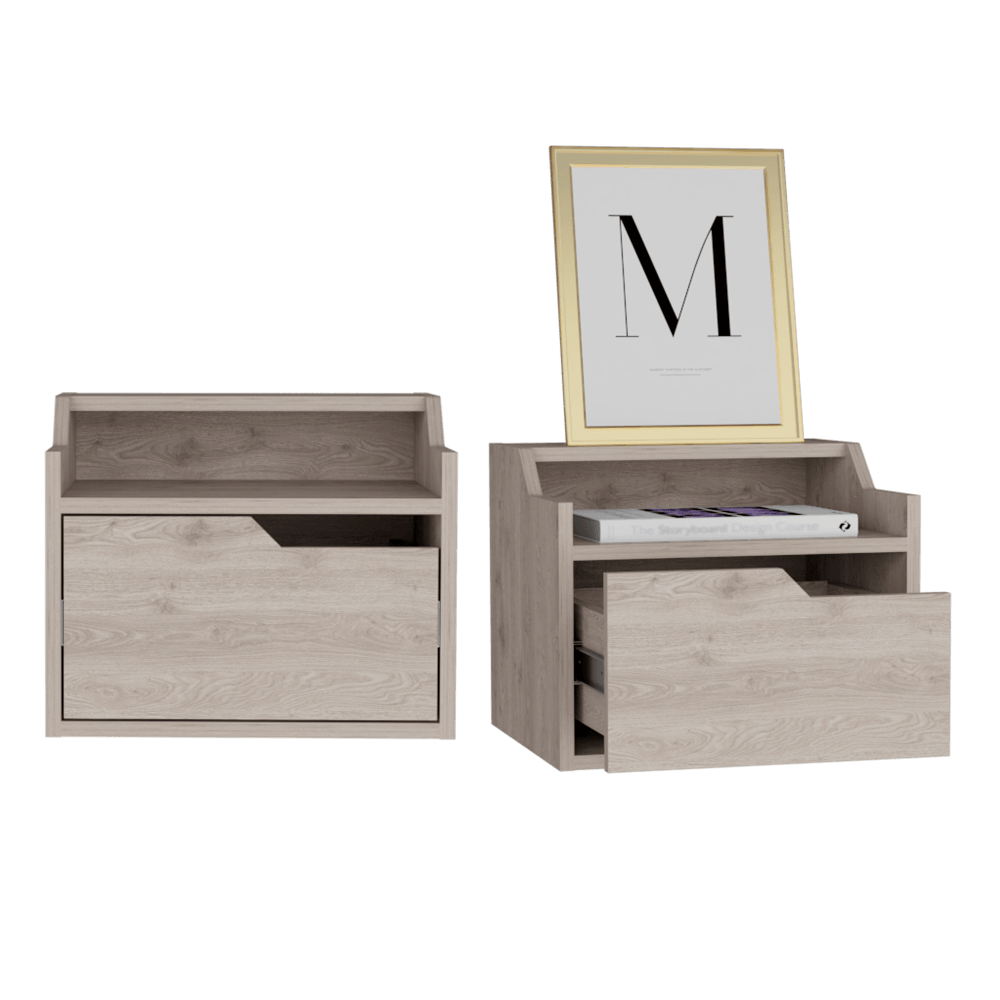 Mesa de Noche Flotante, con espacio para colocar objetos decorativos, diseño moderno y un cajón.
