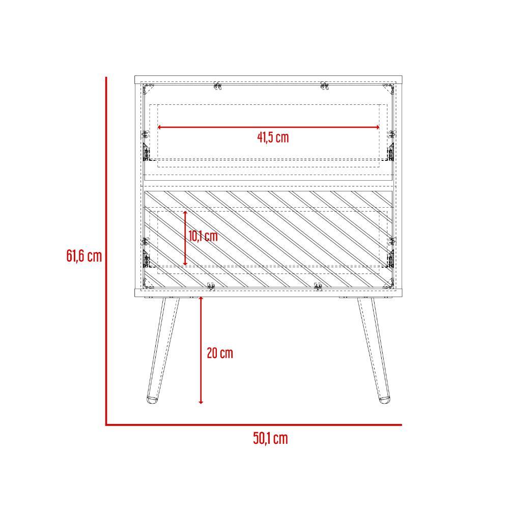Mesa de Noche, con frente cajón termolaminado ranurado, riel sencillo y patas de madera.