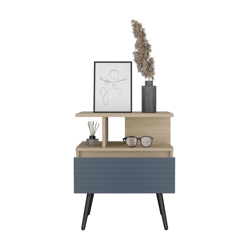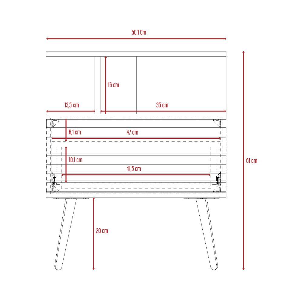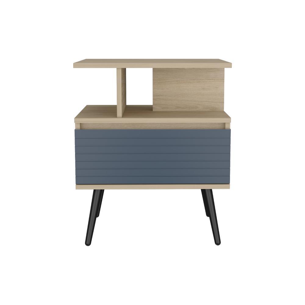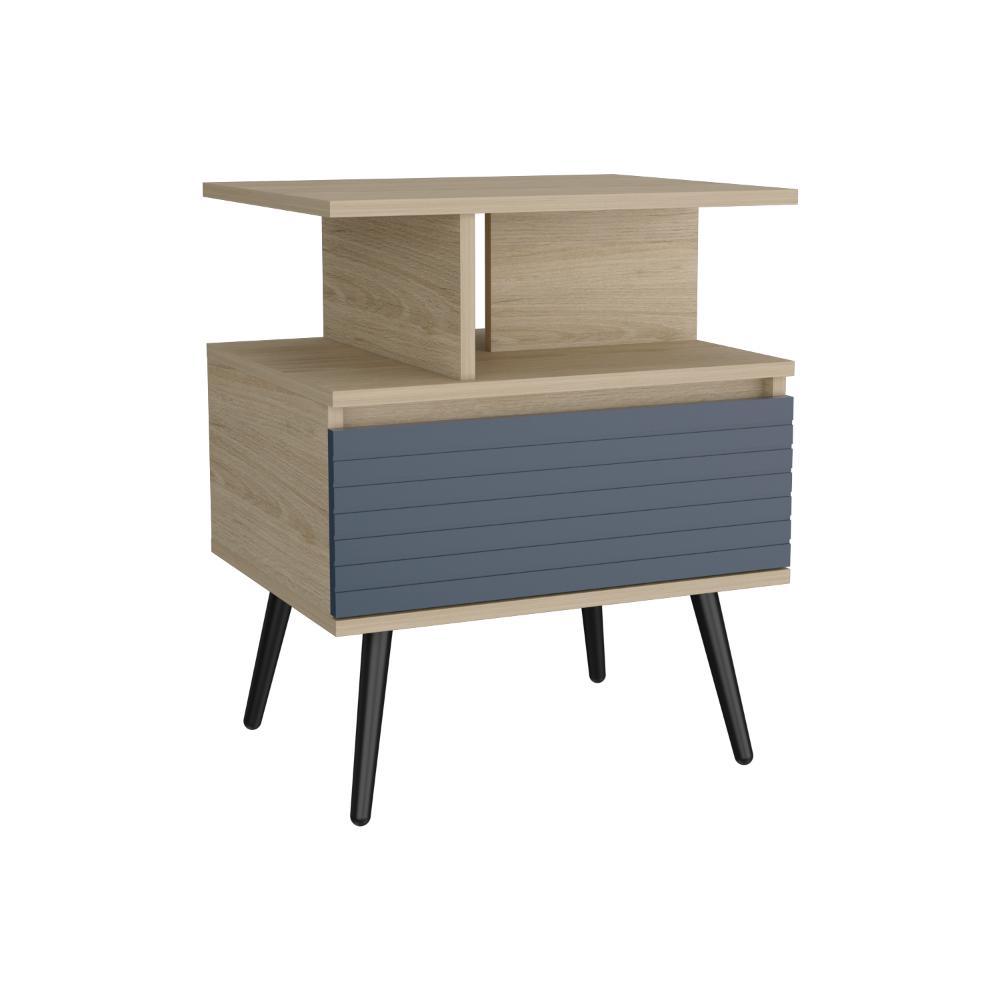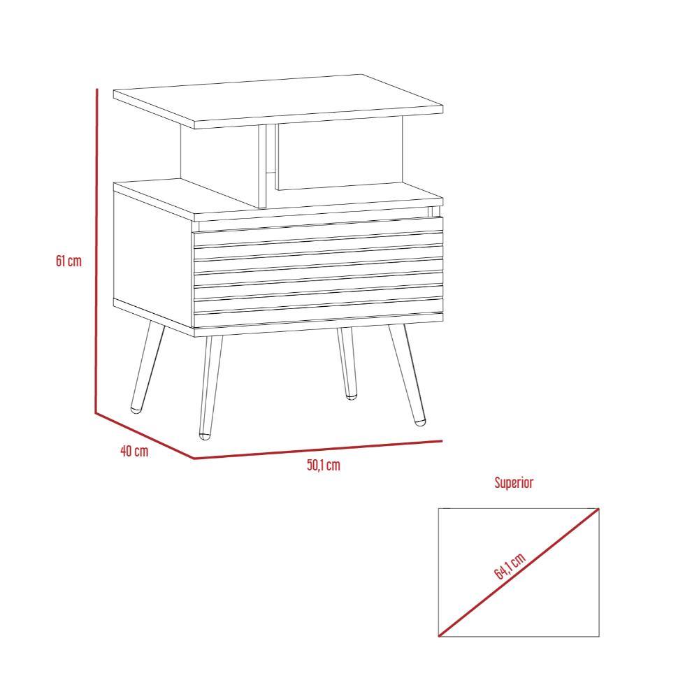 Mesa de Noche, con frente cajón termolaminado ranurado, riel sencillo y patas de madera