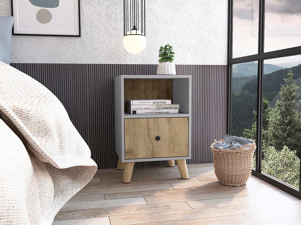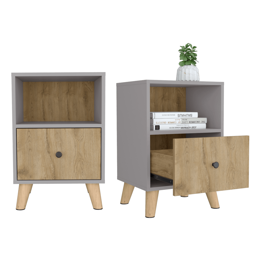 Mesa de Noche Samay, Gris y Macadamia, con Un Cajón y Patas Metálicas X2