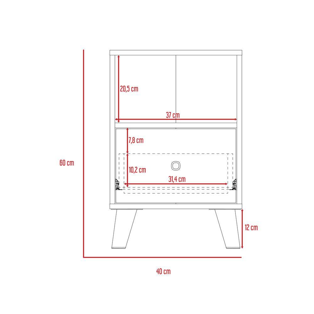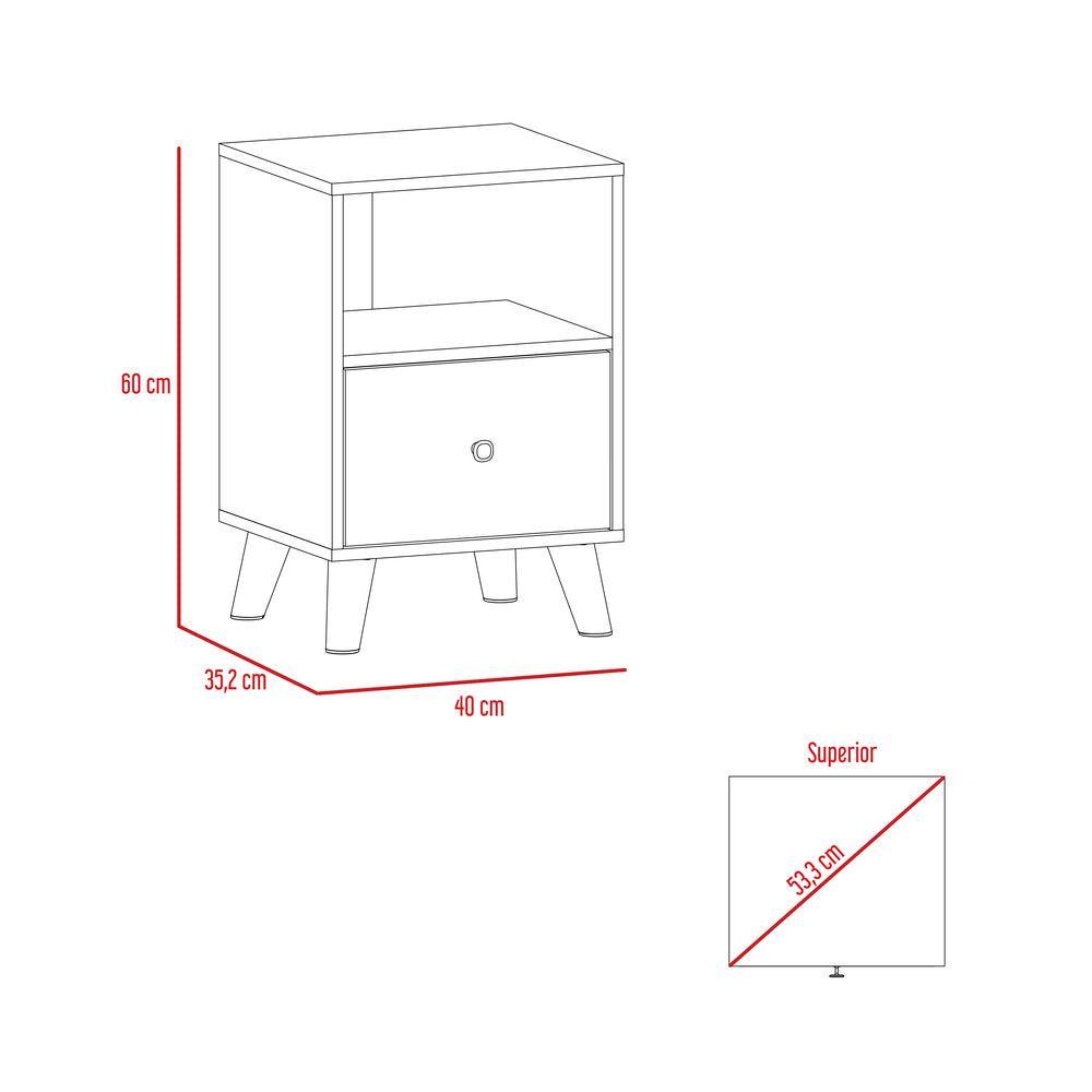 Mesa de Noche, con un cajón, diseño moderno, fácil armado y patas metálicas.