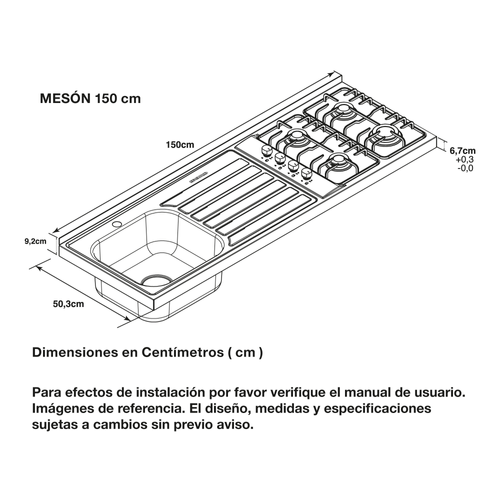 Mesón de empotrar reglado a gas natural para uso doméstico, encendido eléctrico. 150cm.