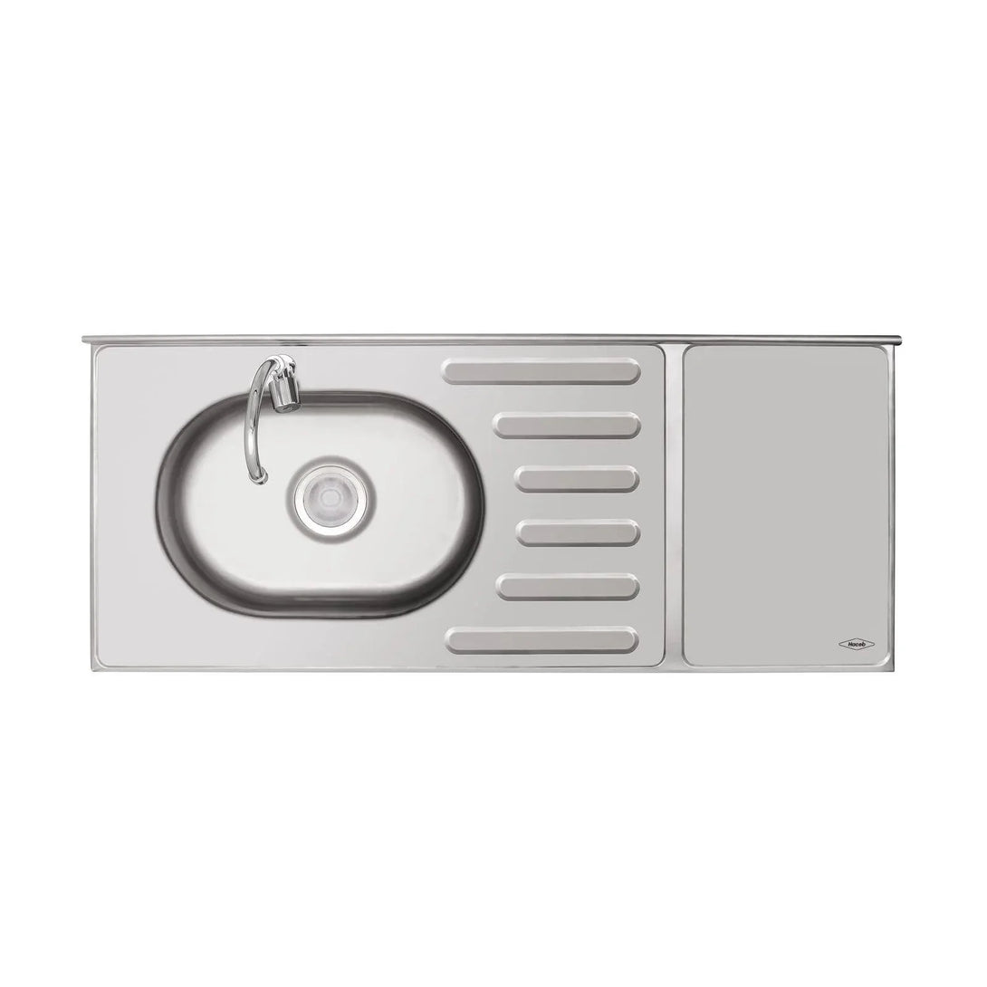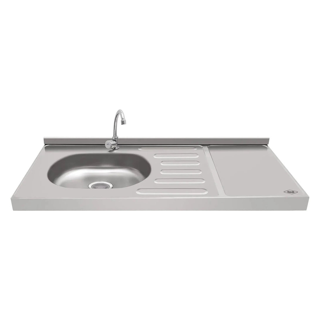 Mesón en acero inoxidable de 1.20 metros de ancho, con ubicación izquierda del pozuelo. Cuenta con lavaplatos, zona de prensado en el centro que evita la filtración de líquidos al mueble y amplia área de preparación.