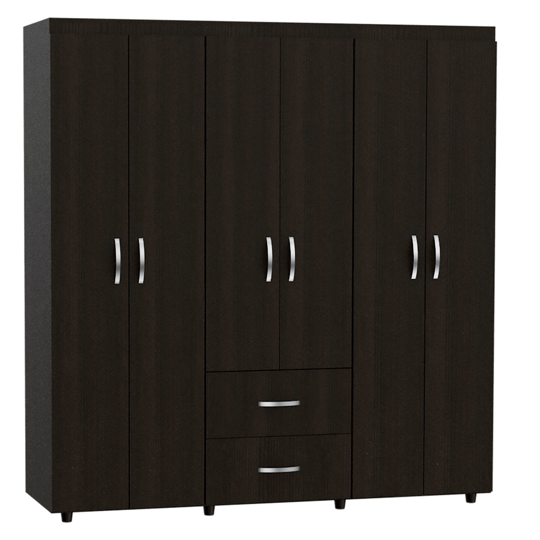Mueble, con amplios espacios y entrepaños para organizar, 6 puertas abatibles, 3 tubos cromados, 2 cajones organizadores, y deslizadores de plástico para apoyo al piso.
