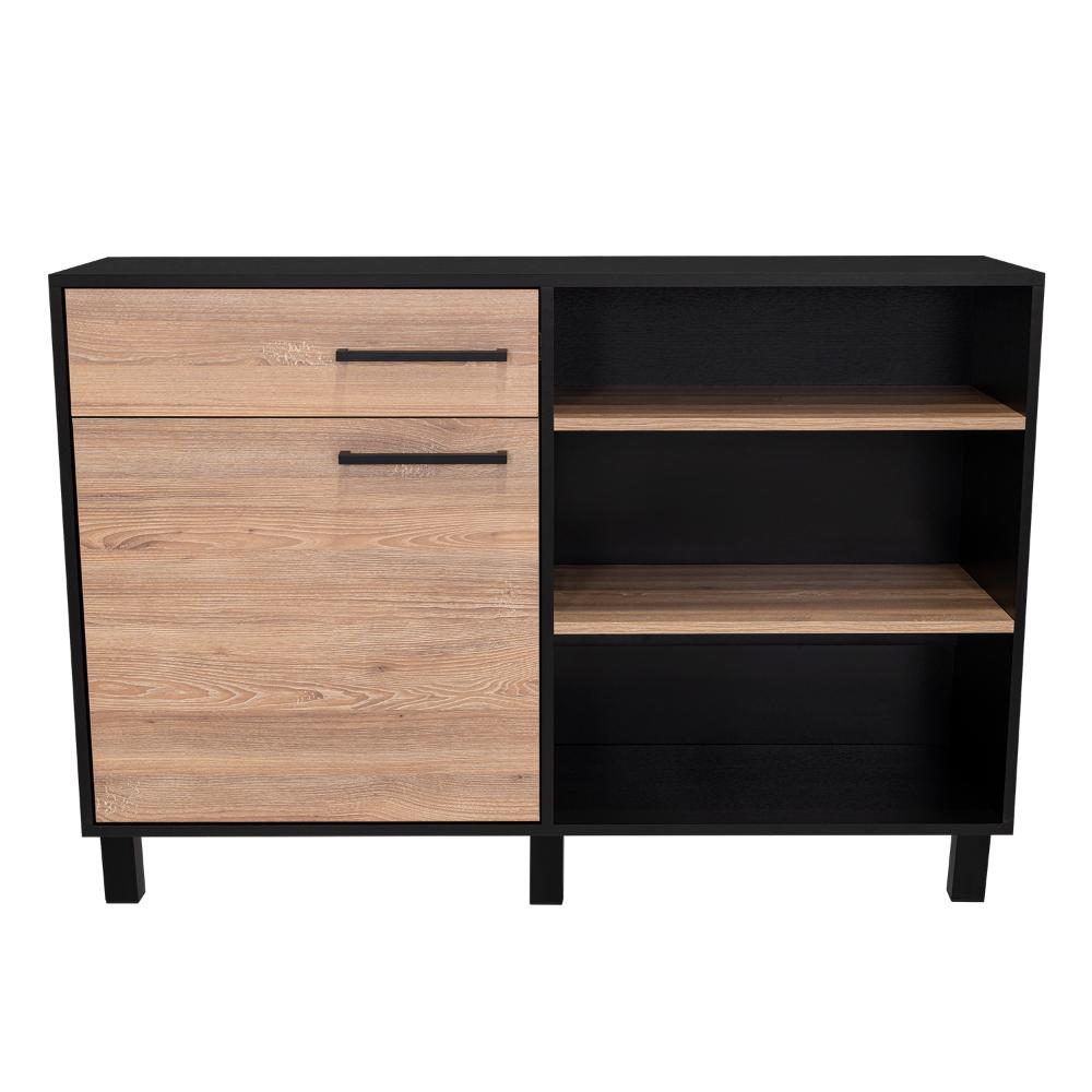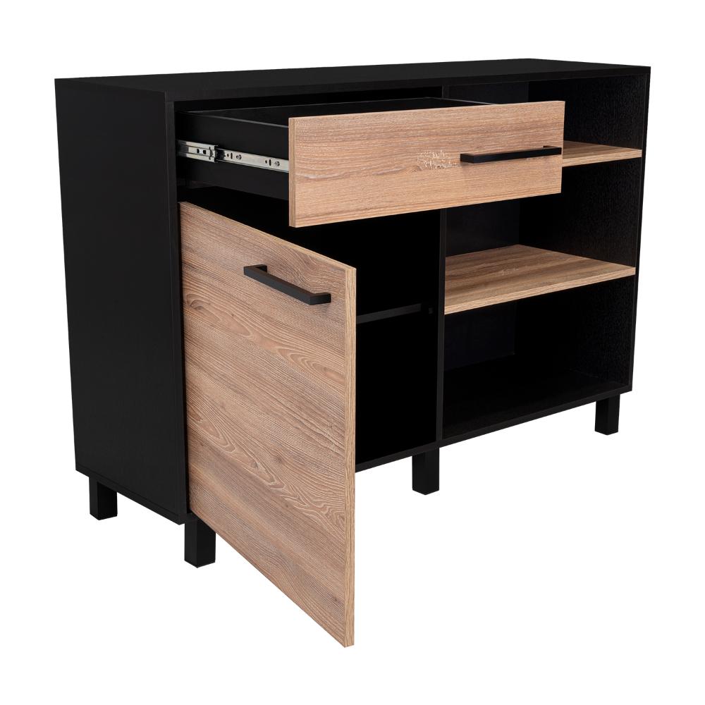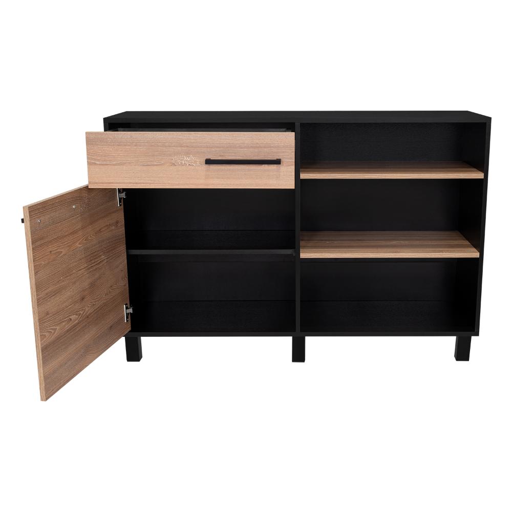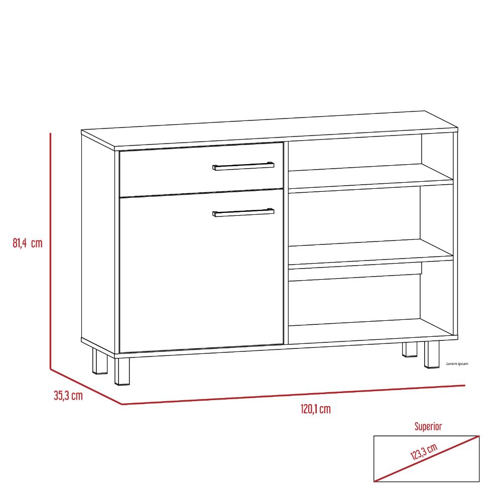 Mesa Multiusos, con un cajón extensión total y una puerta batiente de apertura sin manija. Múltiples entrepaños y superficies para ubicar objetos.