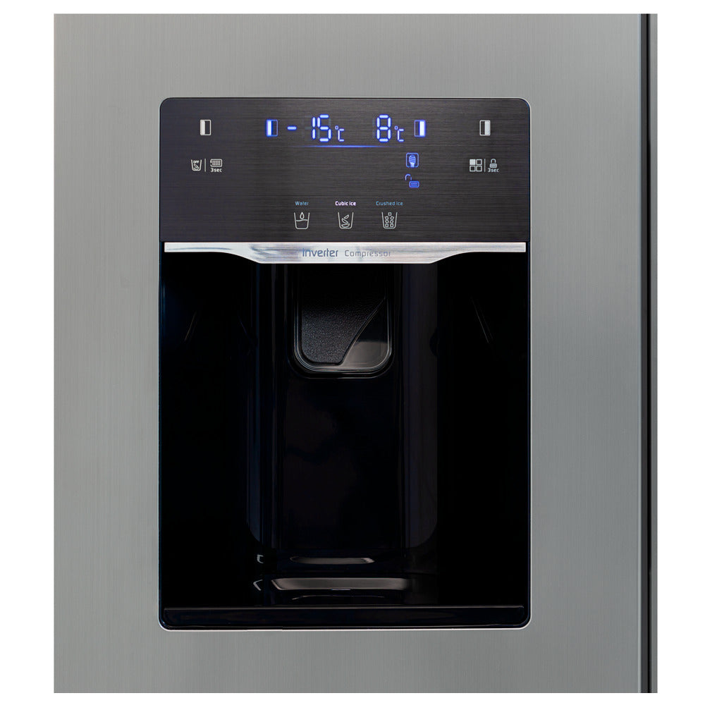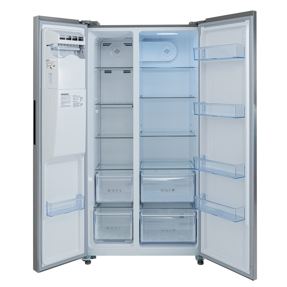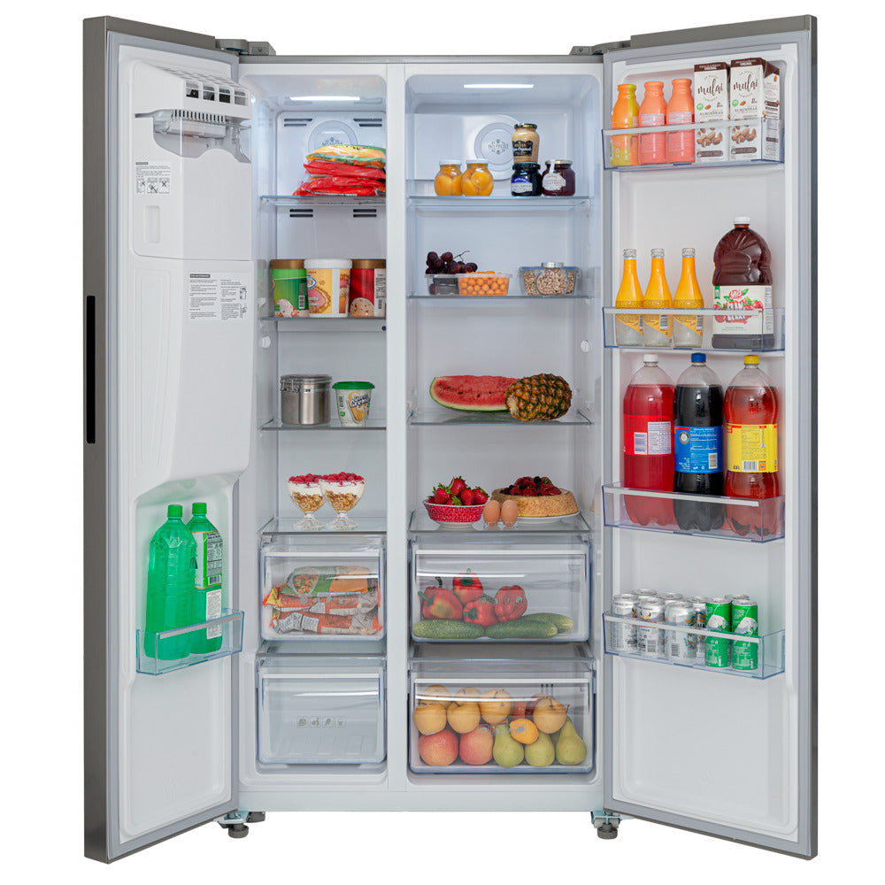 Línea : Side by Side / Tipo de aparato : Refrigerador sin escarcha (No Frost) / Volumen de almacenamiento : 513 L / Clase : Tropical ( T ) / Acabado : Acero inoxidable / Clasificación energética :B / Tensión / Frecuencia: 115 V / 60 Hz / Consumo de energía : 47,6 Kwh / mes / Potencia nominal : 150 W / Gas refrigerante : R600a / Gas espumante : Ciclopentano.