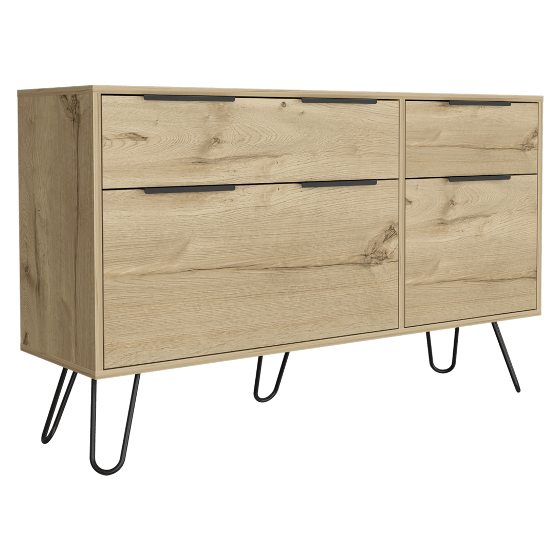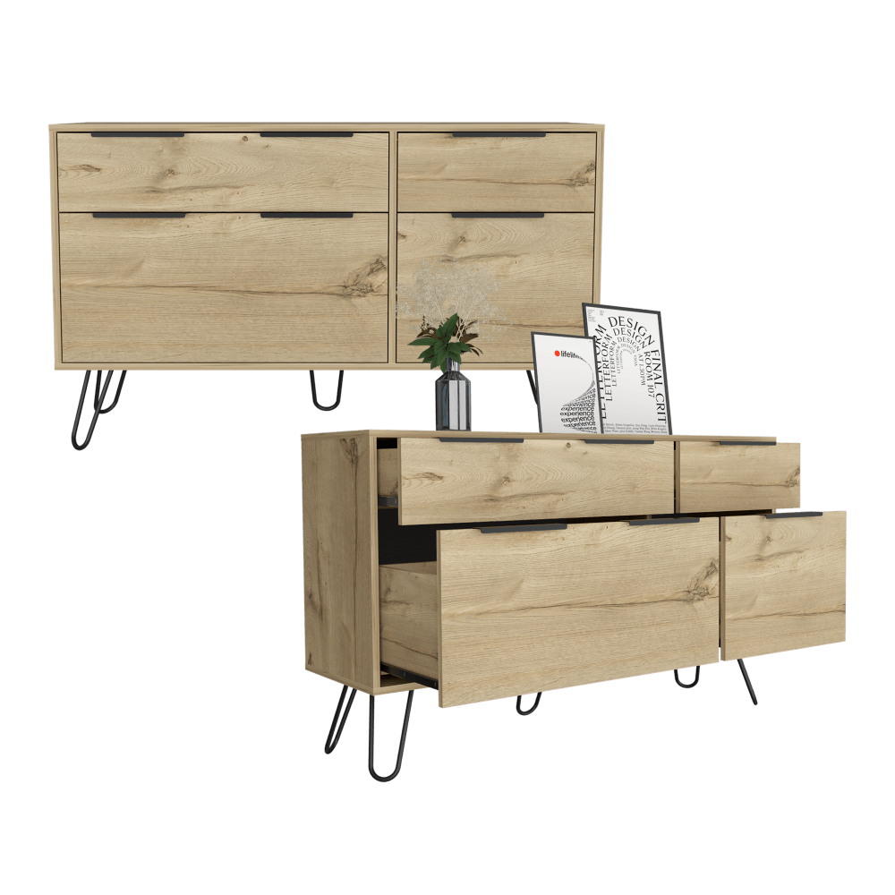 Organizador, doble con espacio para objetos decorativos, cuatro cajones, patas metalicas y diseño moderno