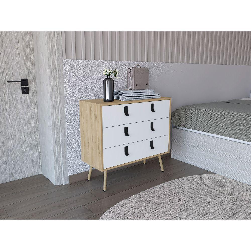 Organizador, con tres amplios cajones deslizadores para guardar objetos personales, espacio superior para objetos decorativos, manijas y rieles metálicos.
