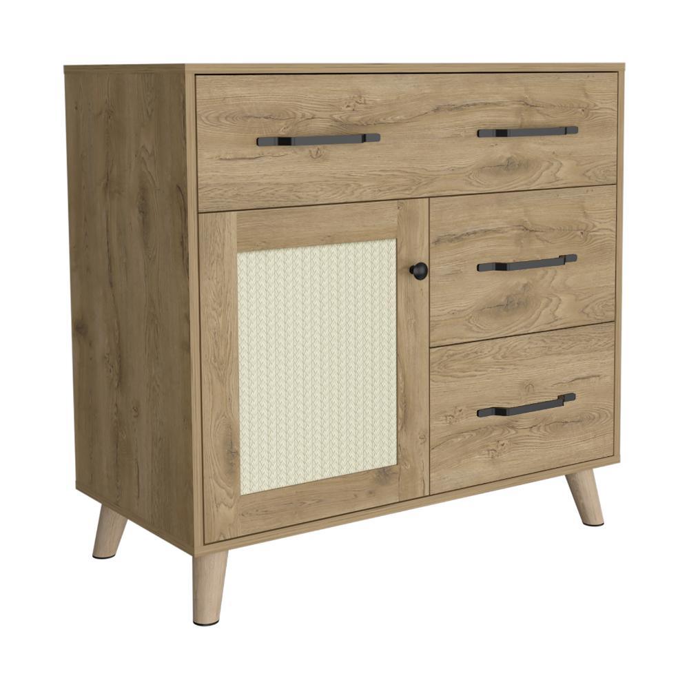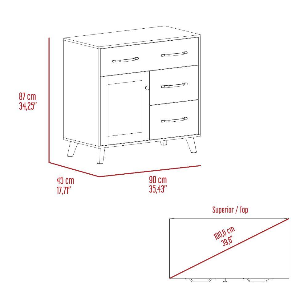 Organizador, con diseño moderno, tres cajones, una puerta, patas metalicas color madera y de fácil ensamble.