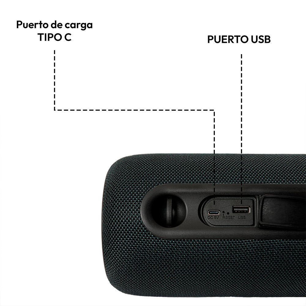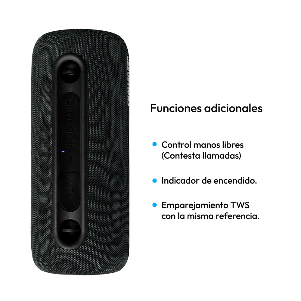 Disfruta del parlante inalámbrico SC15 de 15W RMS, con sonido de alta calidad y Bluetooth v5.3 para una conexión estable. Su batería recargable y diseño compacto con certificación IPX5 lo hacen resistente al agua y fácil de llevar. Incluye micrófono incorporado, entrada USB y USB tipo C. / Experimenta la potencia del parlante portátil SC15 de 15W RMS, diseñado para ofrecer un sonido envolvente y de alta calidad. Gracias a su conexión Bluetooth v5.3, disfrutarás de una conexión estable y eficiente en cualquier entorno. Cuenta con micrófono incorporado, entrada USB (FAT32) y entrada USB tipo C de 5V para recargar, todo en un diseño elegante y resistente al agua con certificación IPX5.