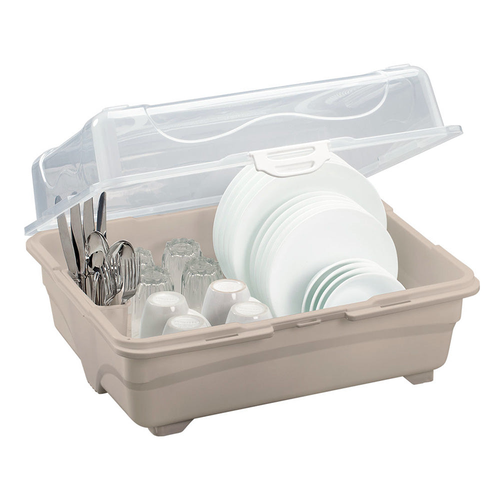 Para escurrir tus platos, cubiertos y vasos; y tenerlos almacenados, en perfecto orden. Tiene dos usos; Escurre los platos y utensilios de cocina, después de lavarlos almacena y protege tu vajilla de contacto con insectos. Cuenta con pequeñas perforaciones en la tapa para ventilación del interior. Tiene manijas que aseguran el contenedor. Tapa abatible que aporta mayor seguridad y practicidad al momento de usarlo en la cocina; así como estabilidad al momento de mover el producto con todo y vajilla en su interior.