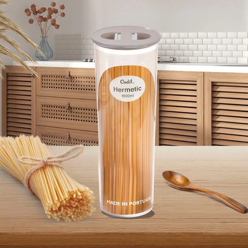 Recipiente hermético para almacenar alimentos secos como arroz, pasta, fríjoles, semillas, frutos secos, etc. Tapa hermética con sistema de vacío que permite conservar la frescura de los alimentos durante más tiempo.