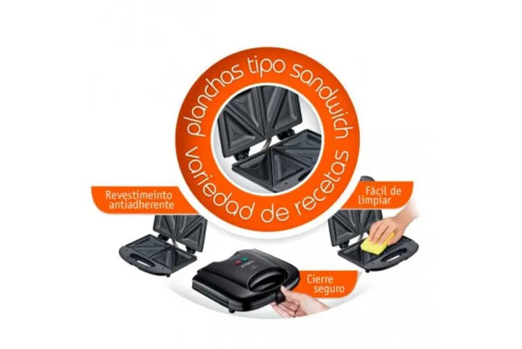 Sanduchera Revestimiento antiadherente, indicadores de encendido y almacenamiento vertical.