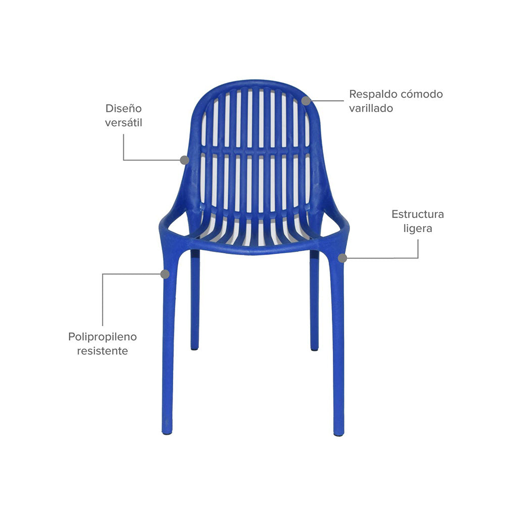 Dale un toque moderno y funcional a tus espacios con esta silla plástica de diseño varillado. Su estructura elaborada en polipropileno de alto impacto la hace resistente y liviana. Ideal para salas, bares y terrazas, es una opción versátil para interiores y exteriores. Además es apilable y no requiere armado, perfecta para un uso funcional.