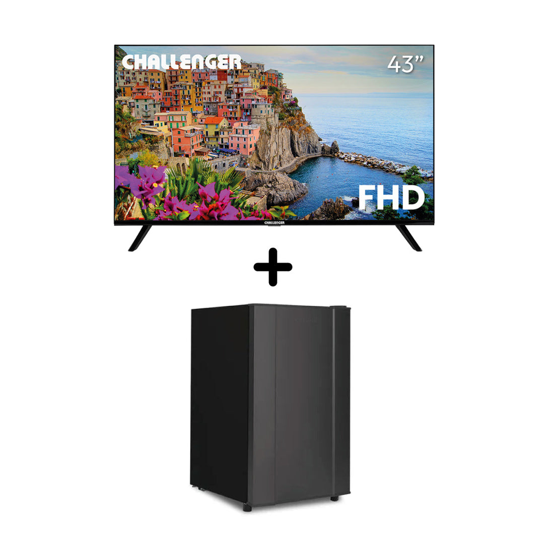 Combo Televisor Challenger 43 Pulgadas Smart Google + Minibar CR 121 Litros, Color Negro y Gris