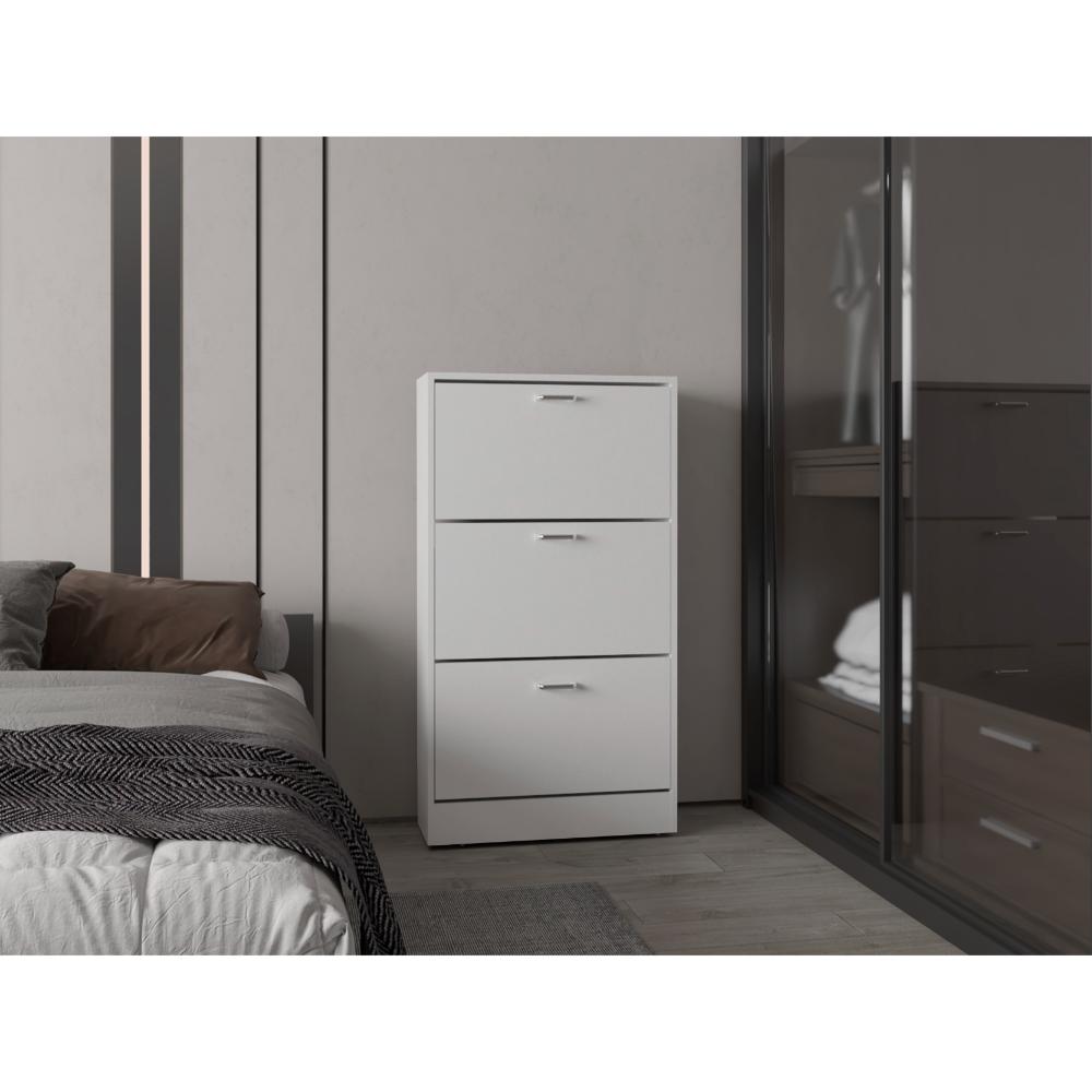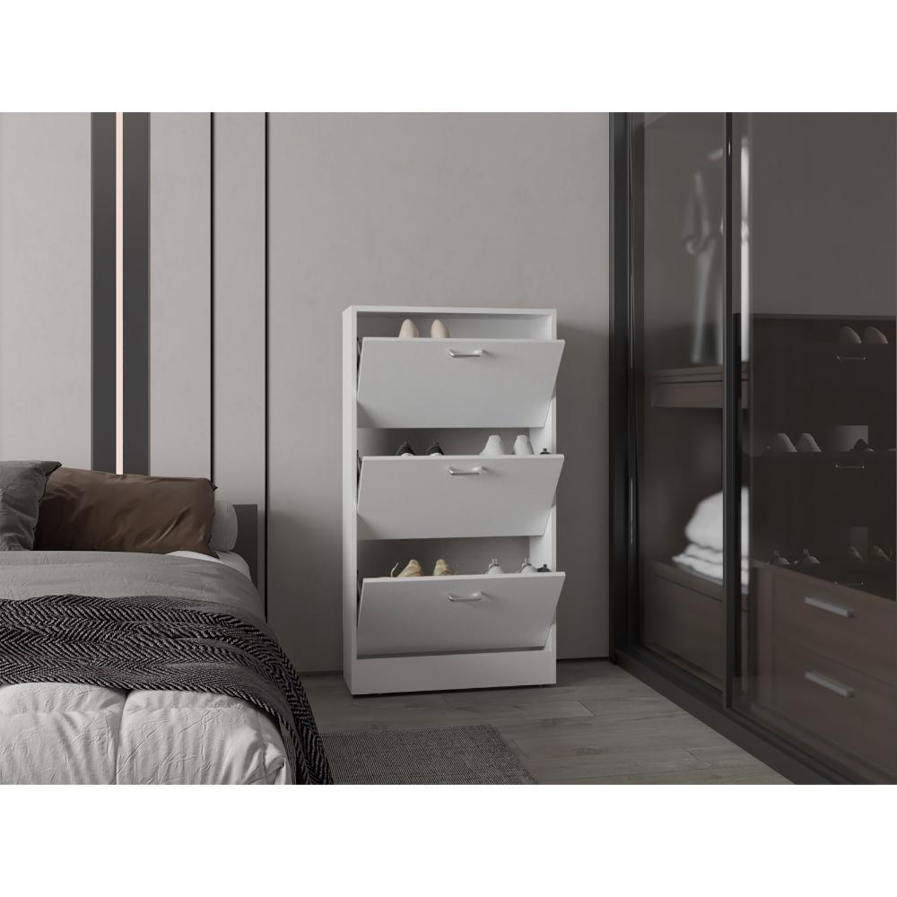 Mueble Zapatero, con espacio para almacenar zapatos, diseño funcional con tres puertas abatibles, manijas metálicas.